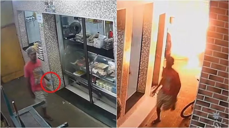 Em seguida, ele joga o conteúdo da garrafa e chamas sobem. O secretário de Segurança Pública de Juazeiro do Norte, Cláudio Luz, informou que o suspeito teria tirado gasolina de uma moto para praticar o crime. Ainda não há detalhes sobre a motivação, mas o secretário comentou que pode ter sido por "situações banais" entre os dois.