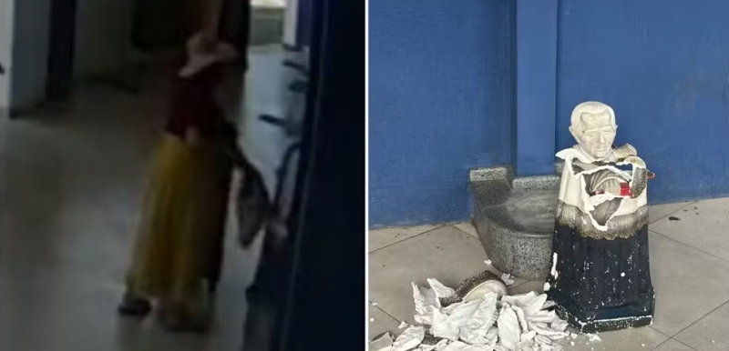 O caso aconteceu por volta das 13h20 e foi flagrado por câmeras de segurança. As imagens mostram a idosa com uma mala e uma bolsa. Após se aproximar da estátua, ela utiliza a bolsa para atingir a peça. Pouco depois, ela usa as mãos para derrubar o item no chão. Com o impacto, a estátua quebrou.