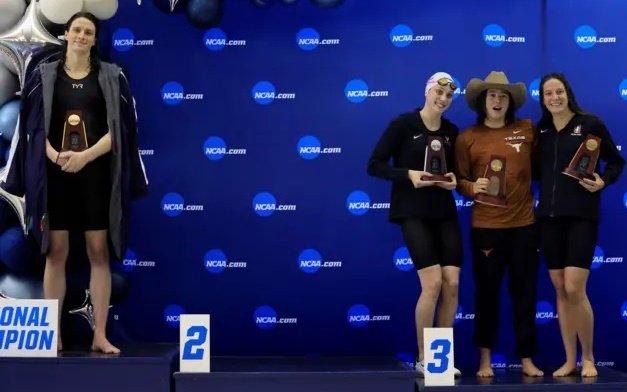 Foto mostra a nadadora transgênero Lia Thomas no topo pódio sozinha enquanto as demais medalhistas — Emma Weyant, Erica Sullivan e Brooke Forde (Foto: Getty Images)
