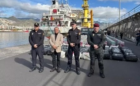 Uma operação internacional de combate ao tráfico transnacional de drogas resultou na apreensão de cerca de 10 toneladas de cocaína em uma embarcação mercante de bandeira estrangeira, interceptada em águas internacionais do Oceano Atlântico, nas proximidades do arquipélago das Canárias.