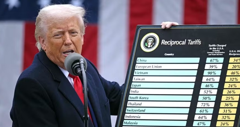 Donald Trump, presidente dos EUA segura um gráfico enquanto discursa sobre tarifas recíprocas durante um evento na Casa Branca em abril (Foto: Brendan SMIALOWSKI / AFP)