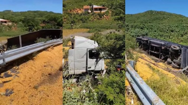 Na manhã deste sábado (26), um grave acidente foi registrado na rodovia estadual PB-262, na altura da Serra do Teixeira, no Sertão da Paraíba. O sinistro ocorreu por volta das 10h30min, envolvendo uma carreta bitrem carregada de grãos de milho.