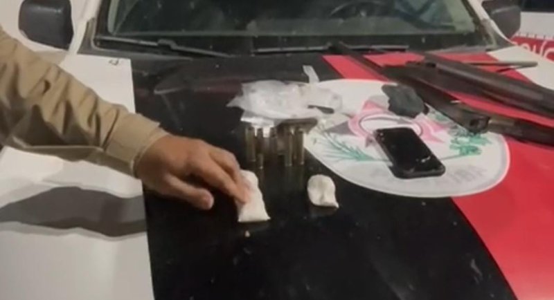 Enquanto isso, outra equipe realizou buscas na residência, onde localizou, no terraço do imóvel — local de onde o suspeito havia saído — mais um pacote de substância semelhante à cocaína, uma espingarda calibre 20 (modelo 651, nº 384109), uma espingarda de pressão calibre 5,5, sete cartuchos calibre 36 deflagrados, um cartucho calibre 20 intacto, um estojo calibre 38 deflagrado e grande quantidade de material utilizado para embalar drogas.