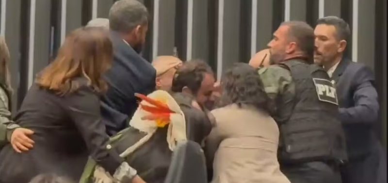 A deputada Célia Xakriabá, também do PSOL, chegou a cair no meio da confusão. Sâmia Bomfim, deputada do PSOL e mulher de Glauber, tentou evitar que ele fosse retirado à força.